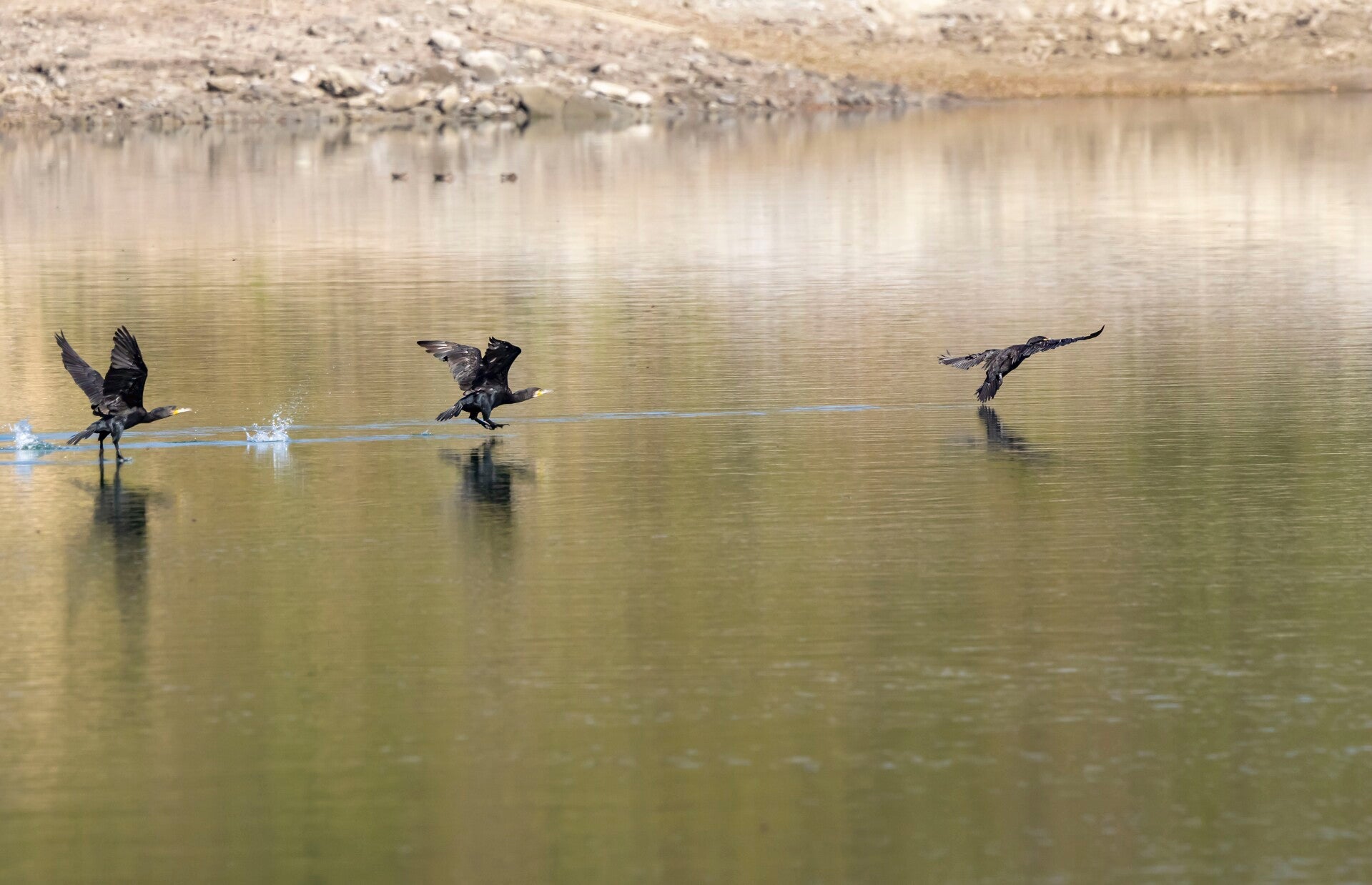 Cormorants burst into flight with powerful strokes, running across the water as they gain speed for take-off. Their dark wings catching the early light, the spray of droplets behind them, and the synchronized movement of the flock create one of the most dynamic scenes a photographer can capture at the wetland.